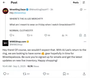 Ein Fan wandte sich auf X direkt an den WWE Shop und fragte, warum es keine Merchandise-Produkte von AJ Lee gebe. In seinem scherzhaften Post schrieb er, dass er wohl gezwungen sei, normale Kleidung zu tragen, wenn er SmackDown einschaltet. Die Antwort, die der WWE Shop darauf veröffentlichte, enthielt brisante Informationen.